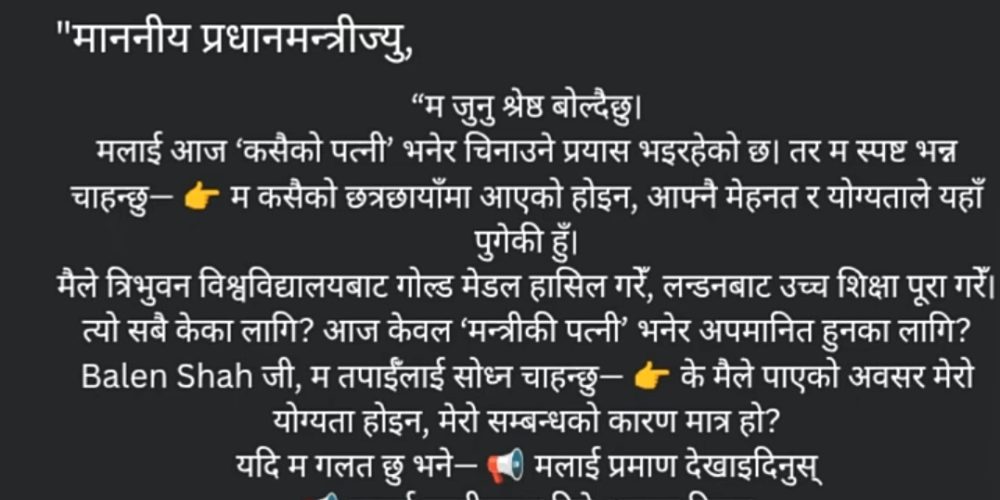 प्रधानमन्त्री साहलाई प्रत्यक्ष प्रश्न गर्दै आफूले पाएको अवसर योग्यता अनुसार हो वा सम्बन्धका कारण भन्ने स्पष्ट पार्न आग्रह गरेकी छन, यदि म गलत छु भने प्रमाण देखाइदिनु मलाई स्पष्टीकरण दिने अवसर दिनुस श्रेष्ठले भनिन ।